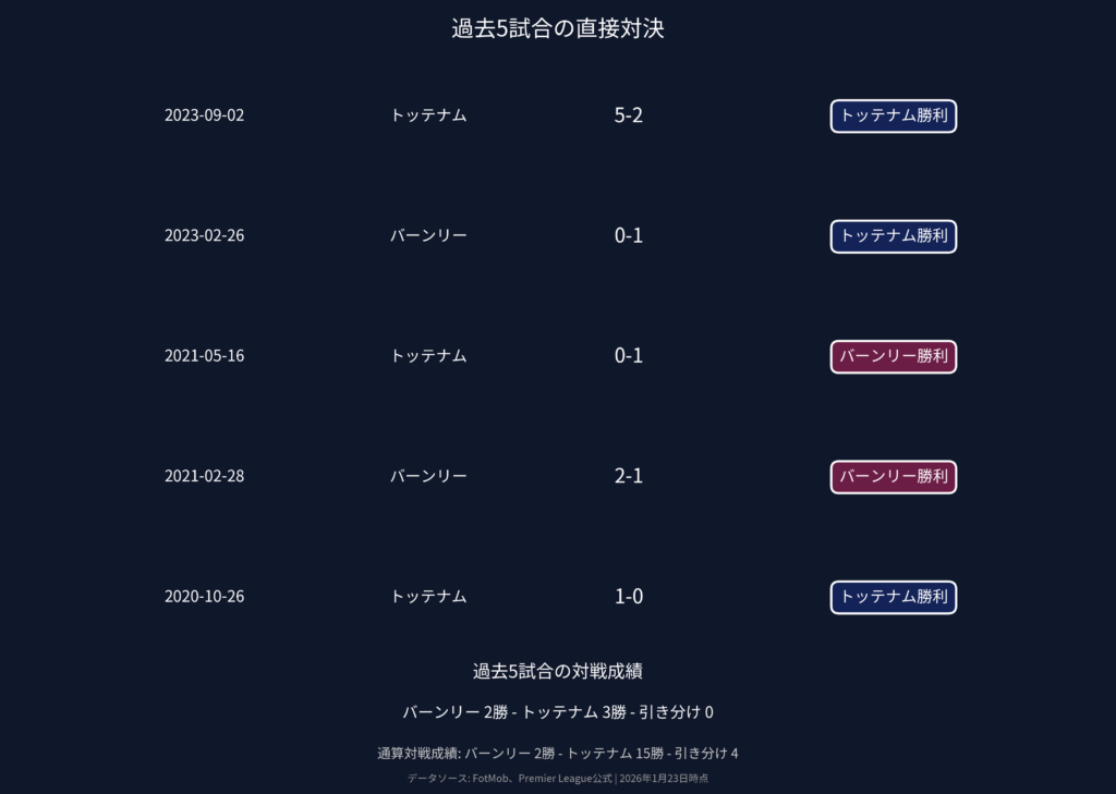 直近5試合の対戦成績では、トッテナムが3勝、バーンリーが2勝と互角の戦いを演じている。最新の対戦となった2023年9月のトッテナム・ホームでは5-2でスパーズが圧勝したが、その前のバーンリー・ホームでは0-1でトッテナムが辛勝。興味深いのは2021年の2試合でバーンリーが連勝している点で、ホームでの粘り強さを見せている。通算対戦成績ではトッテナムが15勝と大きくリードしているものの、近年はバーンリーも善戦しており、ホームアドバンテージを活かした番狂わせの可能性は十分にある。