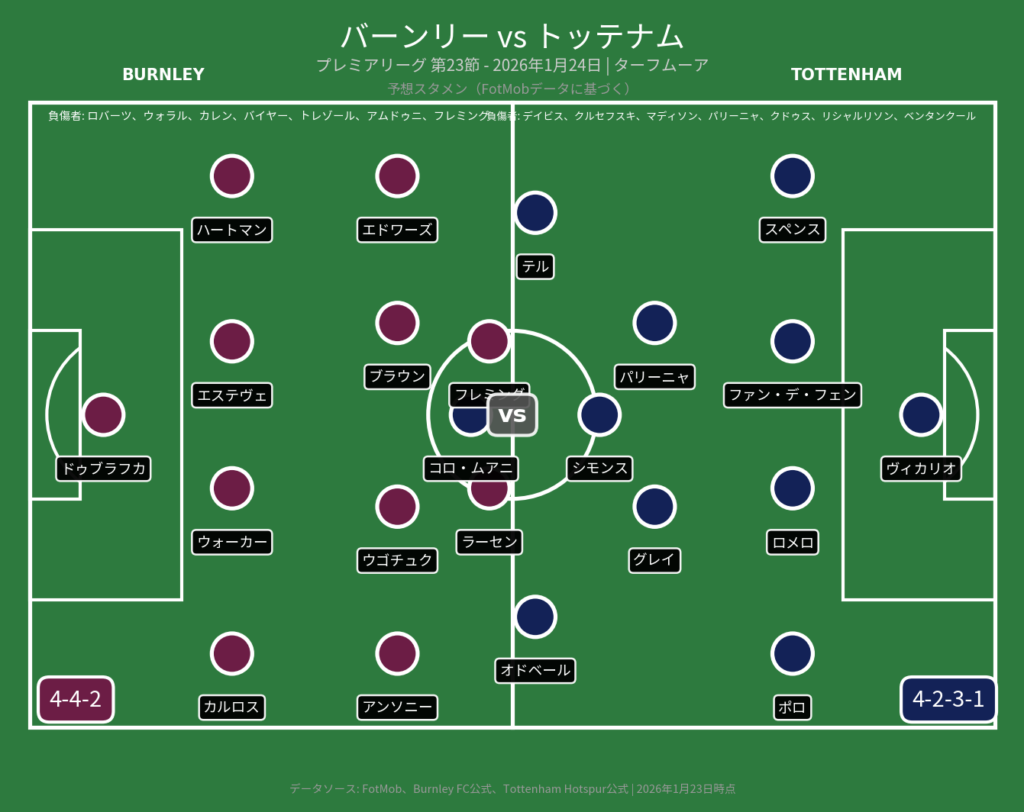 この試合最大の注目点は、両チームの「必死さ」の度合いだ。降格圏のバーンリーは生き残りをかけた戦いで、ホームでの勝ち点3は絶対に欲しいところ。一方、トッテナムはフランク監督への風当たりが強まる中、結果を出さなければさらなる混乱は避けられない。戦術面では、バーンリーのセットプレーが大きな武器となりそう。身長のあるディフェンダーが前線に上がり、混戦から得点を狙う場面が増えるだろう。トッテナムは負傷者だらけの中、シモンスの創造性とコロ・ムアニの決定力に依存する形となり、個の力で局面を打開できるかが鍵となる。