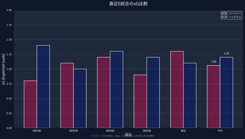 トッテナムの平均xGは1.23とバーンリーの1.05を上回っているが、実際の得点効率では両チーム共に課題を抱えている。バーンリーは22ゴールと創造したチャンスを確実に決めきれていない一方、トッテナムも30ゴールと期待値を下回る。特にトッテナムは主力アタッカーの負傷により、フィニッシュの精度が大幅に低下。バーンリーの方が限られたチャンスを活かす能力では上回る可能性がある。